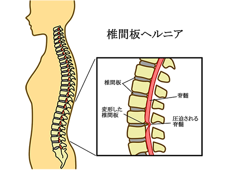 椎間板ヘルニアは、椎間板が何らかの原因で傷んでしまうことにより、中の髄核が飛び出てきて神経(脊髄)を圧迫する病気です。首の骨(頚椎)の間の椎間板が飛び出て首の神経(頚髄)を圧迫しているのが頚椎椎間板ヘルニア、腰の骨(腰椎)の間の椎間板が飛び出て腰の神経(腰髄)を圧迫するのが腰椎椎間板ヘルニアです。